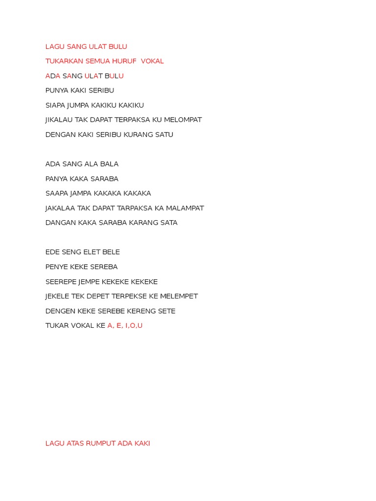 Sapa jumpa kakiku jikalau tak dapat terpaksa ku melompat dengan seribu kurang satu contoh kat bawah ni nyanyi dengan vokal a kata sang alat bala yang panya kaka saraba sapa jampa kakaka jakalaa tak dapat. Sentuh sedikit gatal badanku Sentuh sedikit gatal.